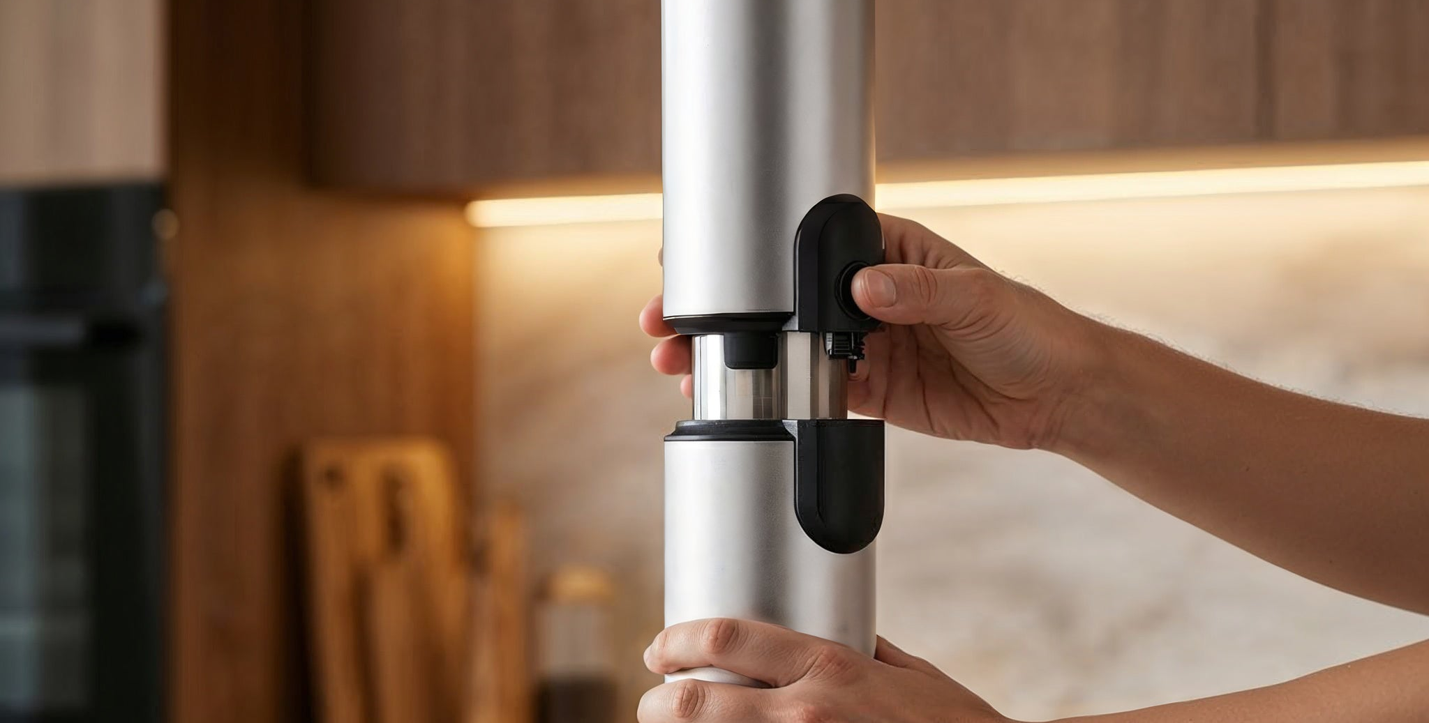 Ahelyett, hogy megfordítanád vagy szétszednéd a gépet, a SodaStage-nél elég megnyomni egy gombot. A palack a felső résszel együtt kihúzható, így könnyen megfogható és kényelmesen cserélhető. Egy apró, de lényeges különbség, amit minden alkalommal érezni fogsz.
