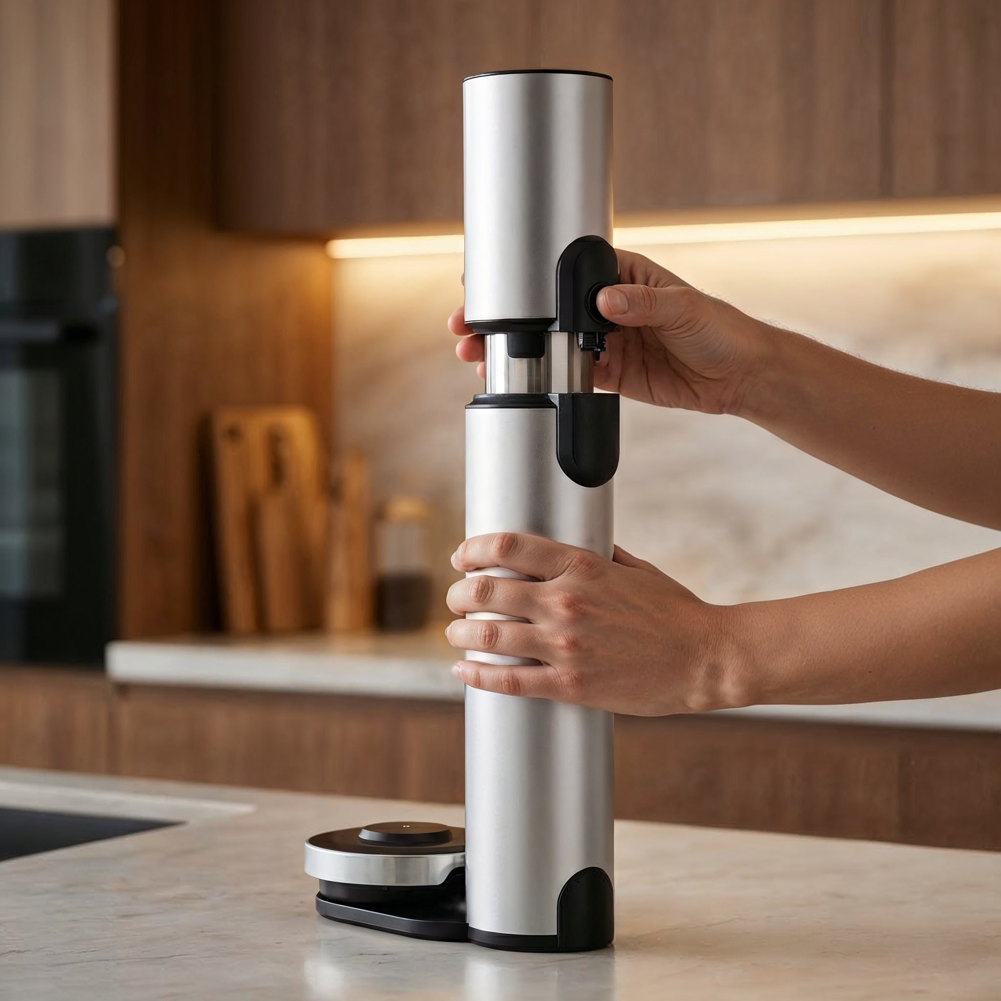 A titok az egyedi kupakban van: a fokozatos nyomáskiegyenlítés miatt nem habzik túl, ezért nem áztatja el a készüléket. Más szódagépeknél ez nem működik – ha például bort próbálnál szénsavazni, az gyakran felfut és a gépben köt ki.